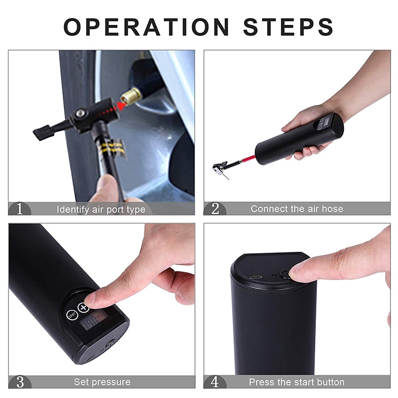 The wireless design and compact mini size make the air compressor portable and easy to operate with one hand. The compressor is ready in only 4 steps. An LCD display indicates the air pressure.Suitable for inflating when the car tires are insufficient and Fully inflated the bicycle and motorcycle tires.